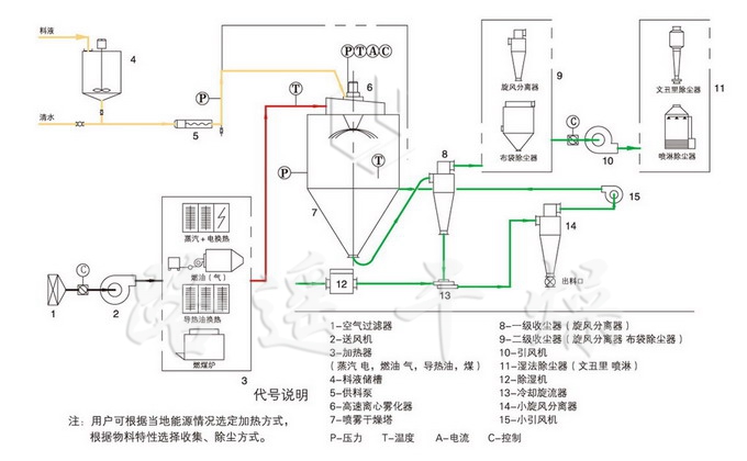 噴霧干燥機為開式循環(huán),并流式,離心式霧化。干燥介質(zhì)空氣經(jīng)過初、中效空氣過濾器過濾后根據(jù)操作指令由鼓風機吸取再經(jīng)加熱器加熱通過高效過濾器的熱風分配器進入噴霧干燥主塔。液體物料根據(jù)操作指令經(jīng)過蠕動泵,進入高速旋轉(zhuǎn)的離心噴頭,在離心力作用下被分散成小霧滴。在噴霧干燥主塔內(nèi),小霧滴與熱風在充分接觸,沿其特定路徑進行熱交換后被干燥成為產(chǎn)品,然后通過旋風分離器實現(xiàn)分離,固體物料被收集,氣體介質(zhì)再經(jīng)過過濾后被排出。整套噴霧系統(tǒng)易清潔、無死角,符合GMP要求。