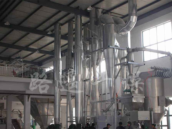 底部強化器設(shè)計獨特,攪拌齒為菱形,其流線性能使風(fēng)阻達到小,設(shè)置在圓錐形料斗內(nèi),分動刀和定刀,粉碎效果顯著,使下落的結(jié)塊物料迅速粉碎為適合氣流干燥的粉粒料,攪拌的另一個主要作用是分散物料,加大了與料斗下面進來的高速熱風(fēng)的接觸面積,于是料斗區(qū)形成了一個強烈傳熱傳質(zhì)的流化床,大部分濕分在料斗區(qū)被干燥。隨著干燥的進行,變輕變細的干料受氣流作用明顯,與氣流一起上升并進一步干燥,后從干燥塔頂部出來進入物料收集···